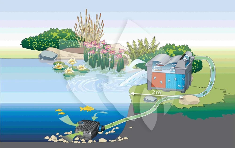 Wat doet de AquaMax Eco Classic 3500E? De pomp zorgt niet enkel voor bewegend water in uw vijver waardoor de zuurstoftoevoer optimaal is, daarnaast zuivert de pomp het vijverwater. De pomp pompt vijverwater met grove verontreiniging (deeltjes tot max. 8mm) naar een filter. Het filter zorgt er op zijn beurt vervolgens voor dat het water gereinigd wordt.